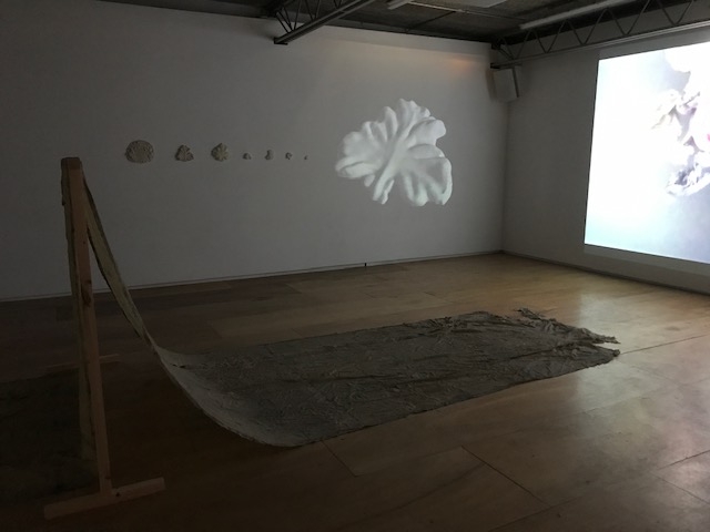 Installation with wood, silicone, ceramic 3-d prints, 2 channel video.