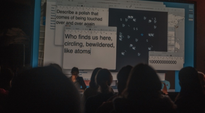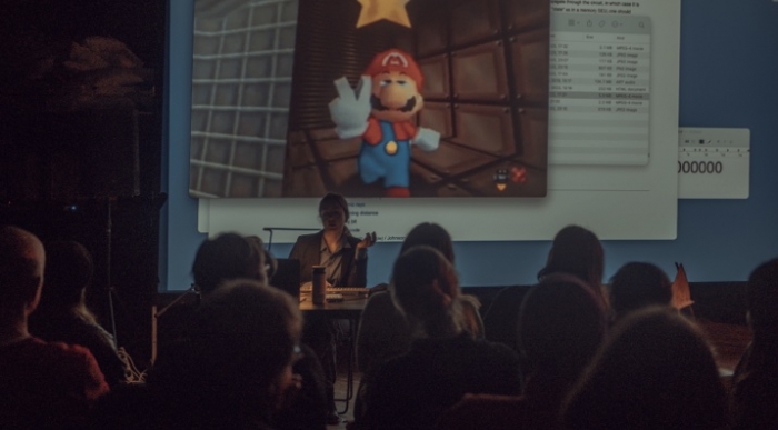 Under the guise of info dumping, which is the process to share and give information of a specific topic at length and in great detail, at once, often without interruption, the lecture performance presents the narration of gleaned knowledge. Wandering through each element, the talk is punctuated of supporting documents and anecdotes, ranging from maps issues by the US geological society to a Mario64 speed run, passing through quotes from 13th century Persian poetry as a basis for reflection of the construction of knowledge, memes, comparison of Wikipedia pages by language, explanation of cosmic rays, real time and time travel in multiplayer modes, and invisible fields and forces.